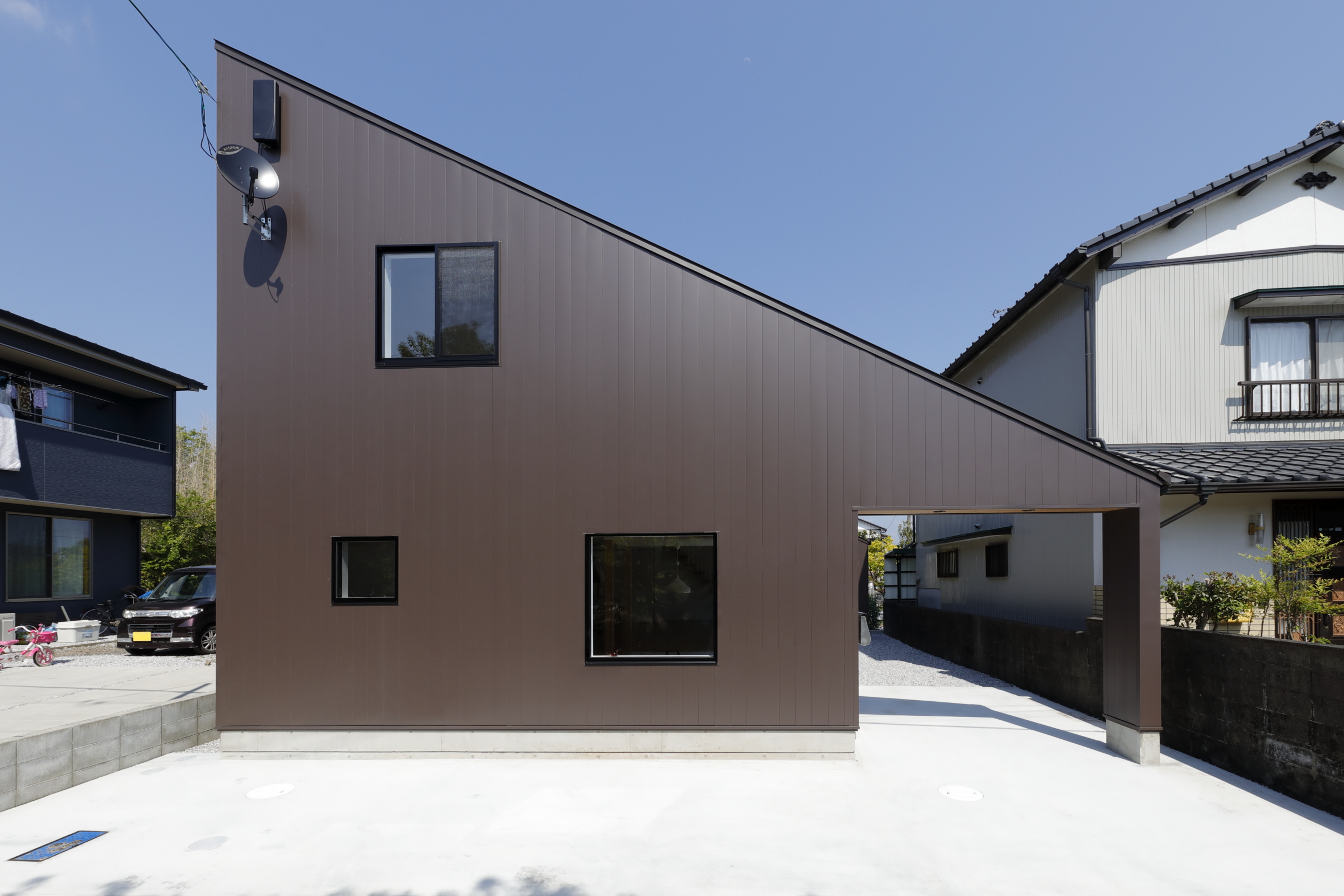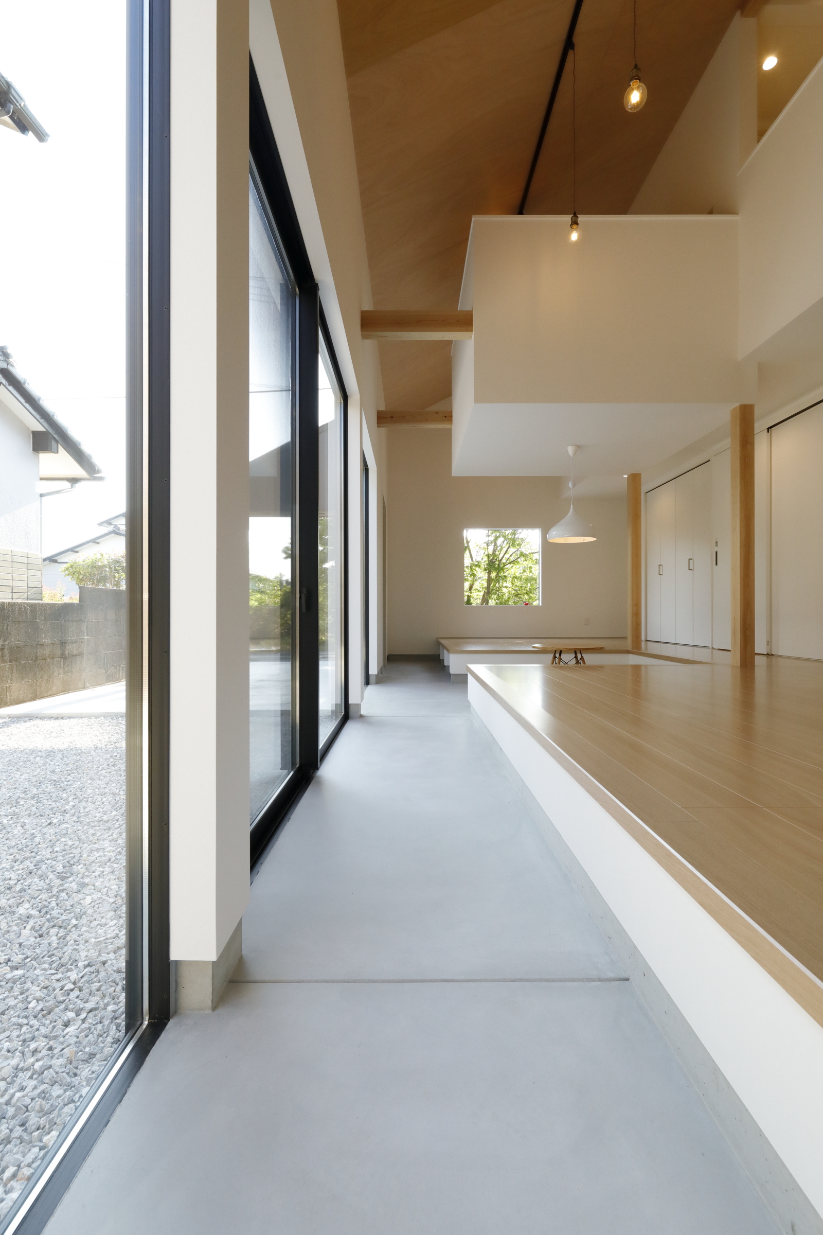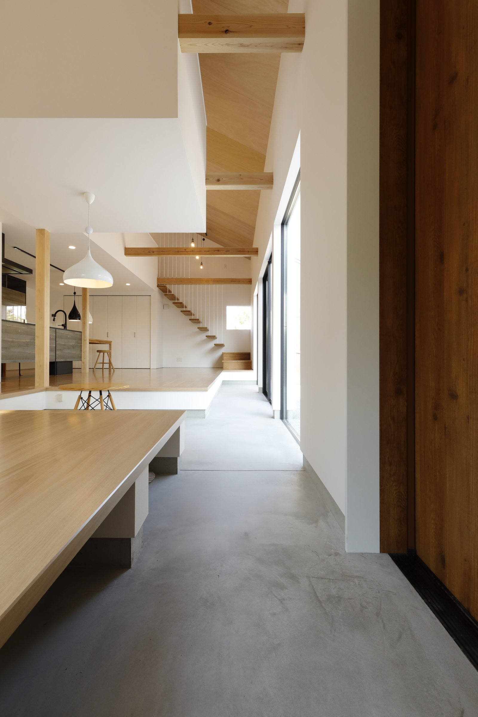 住宅地に建つ個人住宅。コの字型の平面と1層から2層まで切り落とした片流れの屋根で構成し、コストを削減している。凸型にLDKに張り出した土間は中庭と室内を繋いでいる。建物を見通しの良い一つの空間とする為、壁は最小限に抑え階段とニッチは梁から吊って軽やかな造りとした。