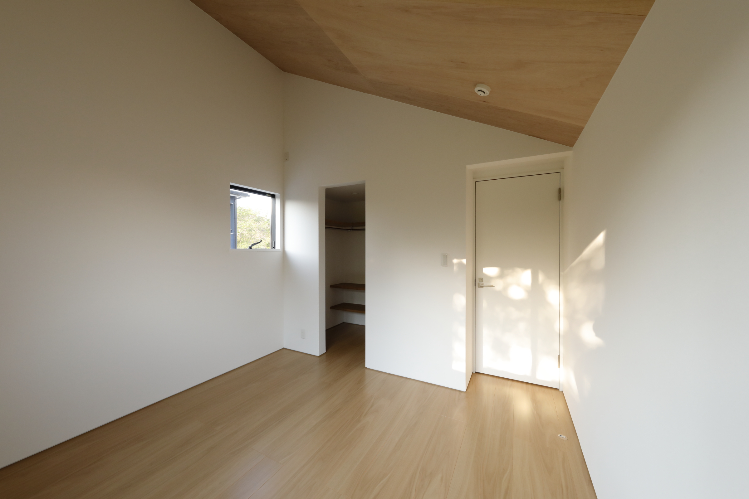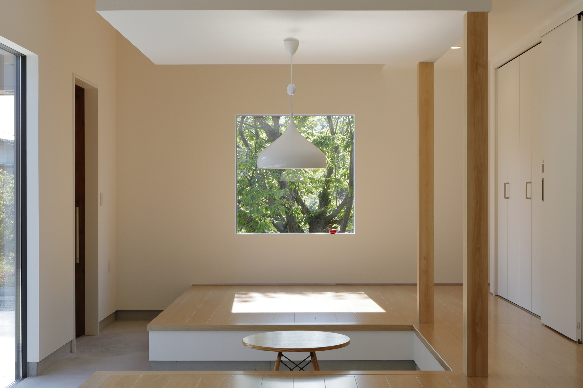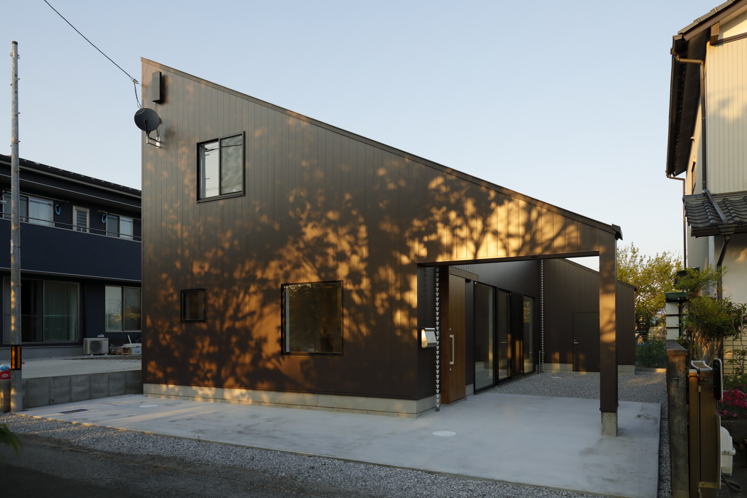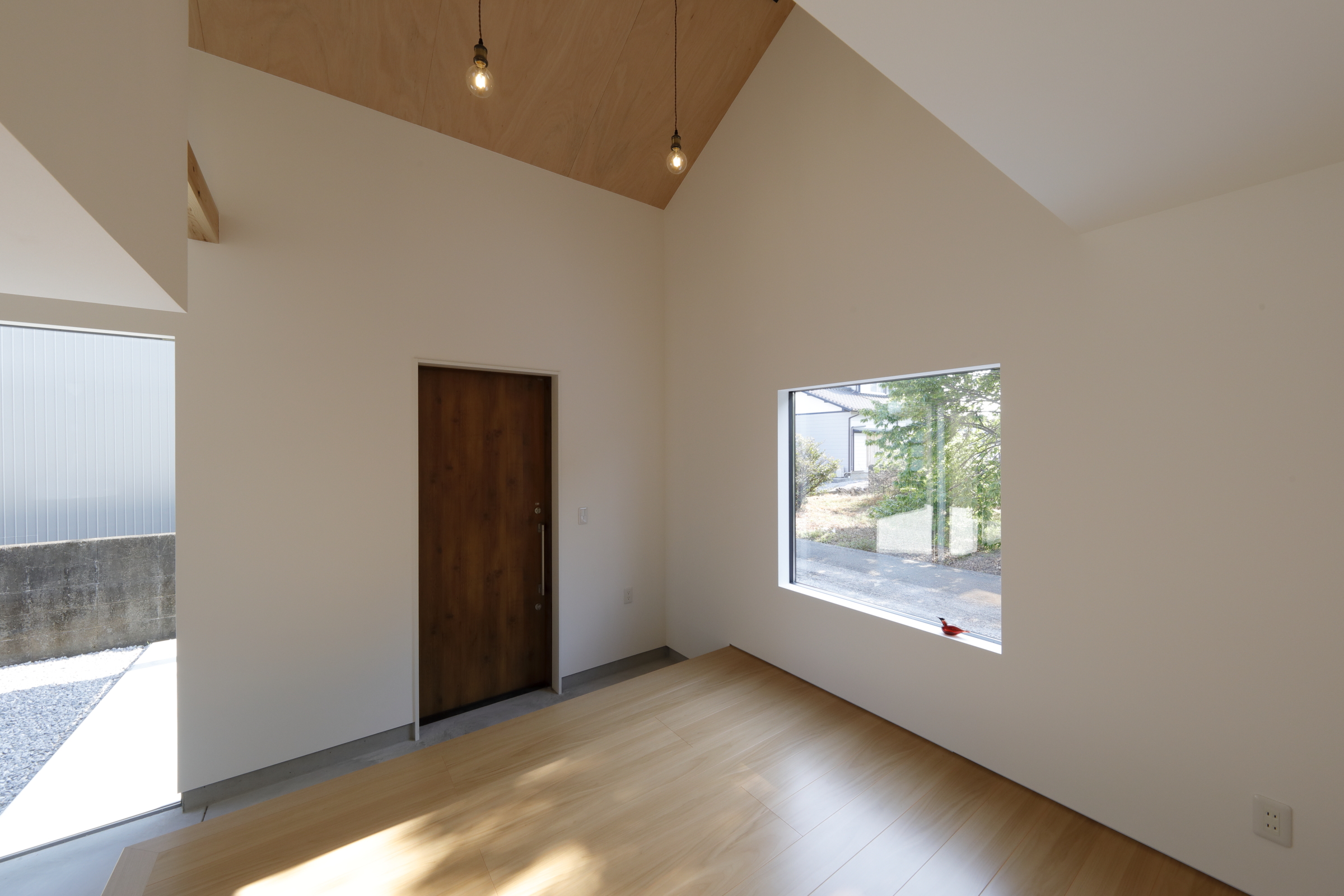 住宅地に建つ個人住宅。コの字型の平面と1層から2層まで切り落とした片流れの屋根で構成し、コストを削減している。凸型にLDKに張り出した土間は中庭と室内を繋いでいる。建物を見通しの良い一つの空間とする為、壁は最小限に抑え階段とニッチは梁から吊って軽やかな造りとした。